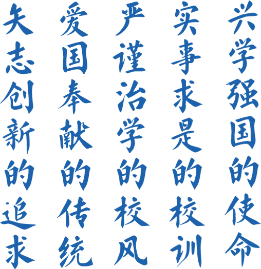 “兴学强国”是我们的使命,是与生俱来的文化基因,是中国大学的精神元始。“实事求是”是我们的校训,从实际出发探索真理、把握规律,是百年办学的基本遵循。“严谨治学”是我们的校风,是在办学实践中形成的优良品格,是天大人的治学标准。“爱国奉献”是我们的传统,始终以国家和民族利益为重,是天大人的人生选择。“矢志创新”是我们的追求,勇立潮头,锐意进取,敢为人先,创新超越,是对至真至善孜孜以求的精神境界。坚持兴学强国的使命、实事求是的校训、严谨治学的校风、爱国奉献的传统和矢志创新的追求,是天大品格的核心表达,是激励全体天大人建设中国特色世界一流大学的强大精神动力。